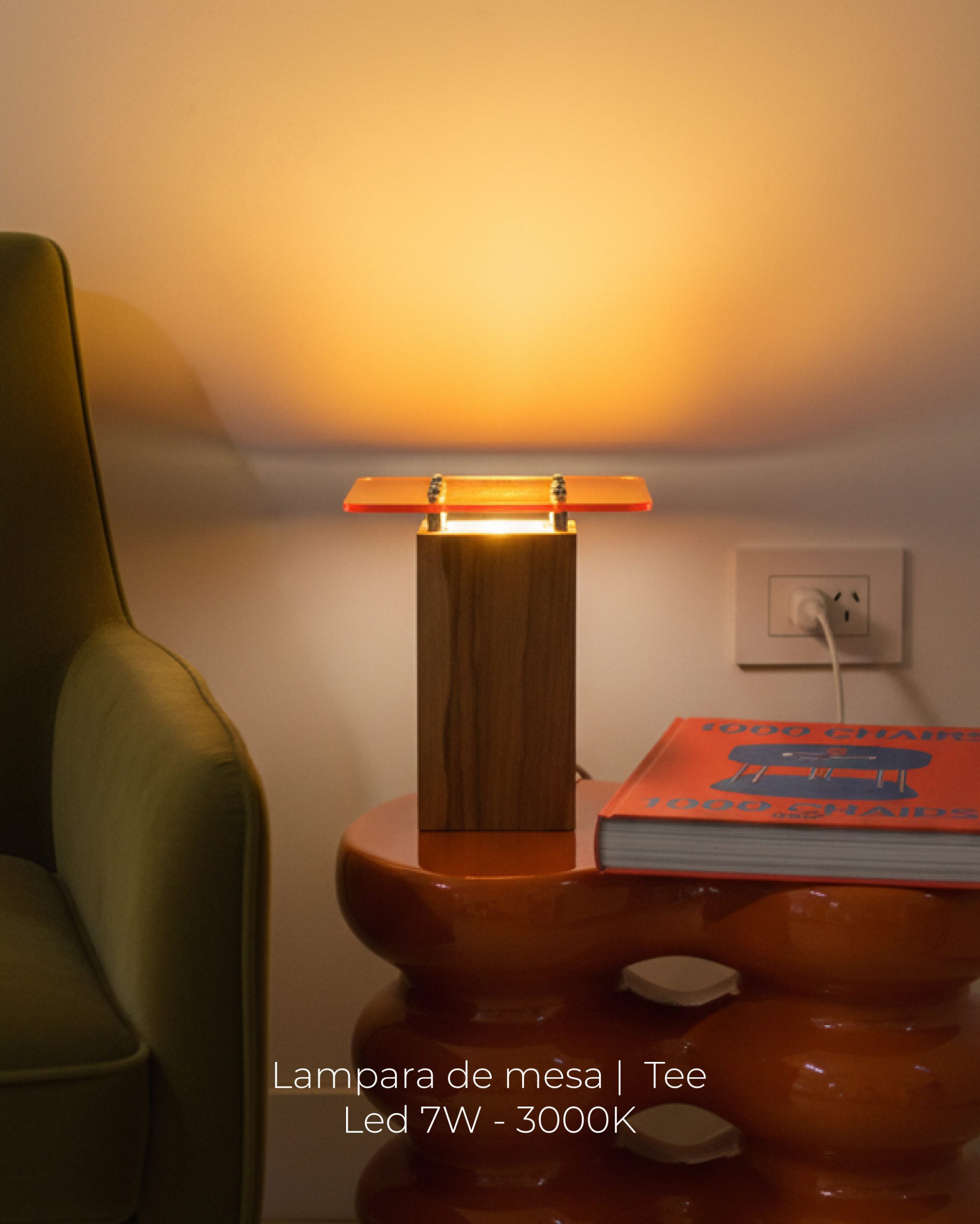 Cuerpo de guayubira maciza con vetas marcadas y cálidas. Su pantalla de acrílico genera un efecto óptico sutil y único al encenderse, proyectando luz suave y envolvente. Una pieza de diseño que combina materia noble y percepción visual.